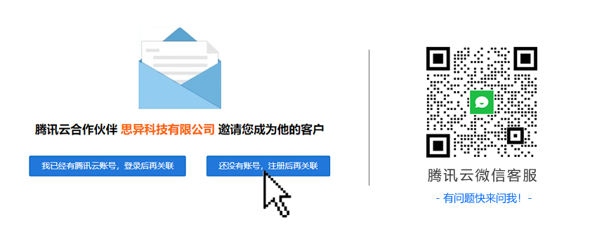 第一步:注册关联帐号 点击连接 https://partner.cloud.tencent.com/invitation/18140140005f9918d01cb72 已经有腾讯云账号,登录后再关联;还没有账号,注册后再关联(注册关联后联系本站客服审核,没有关联帐号无法获得折扣优惠)。
